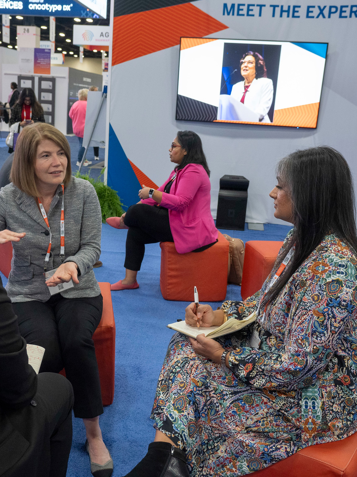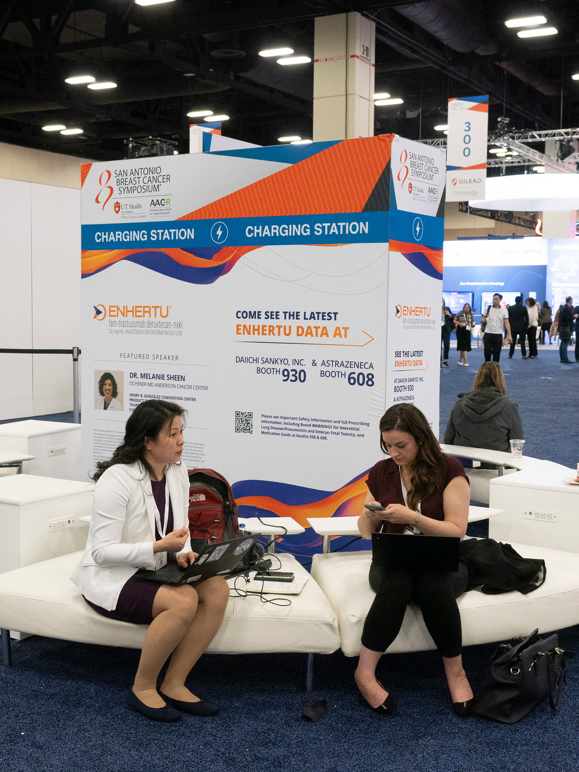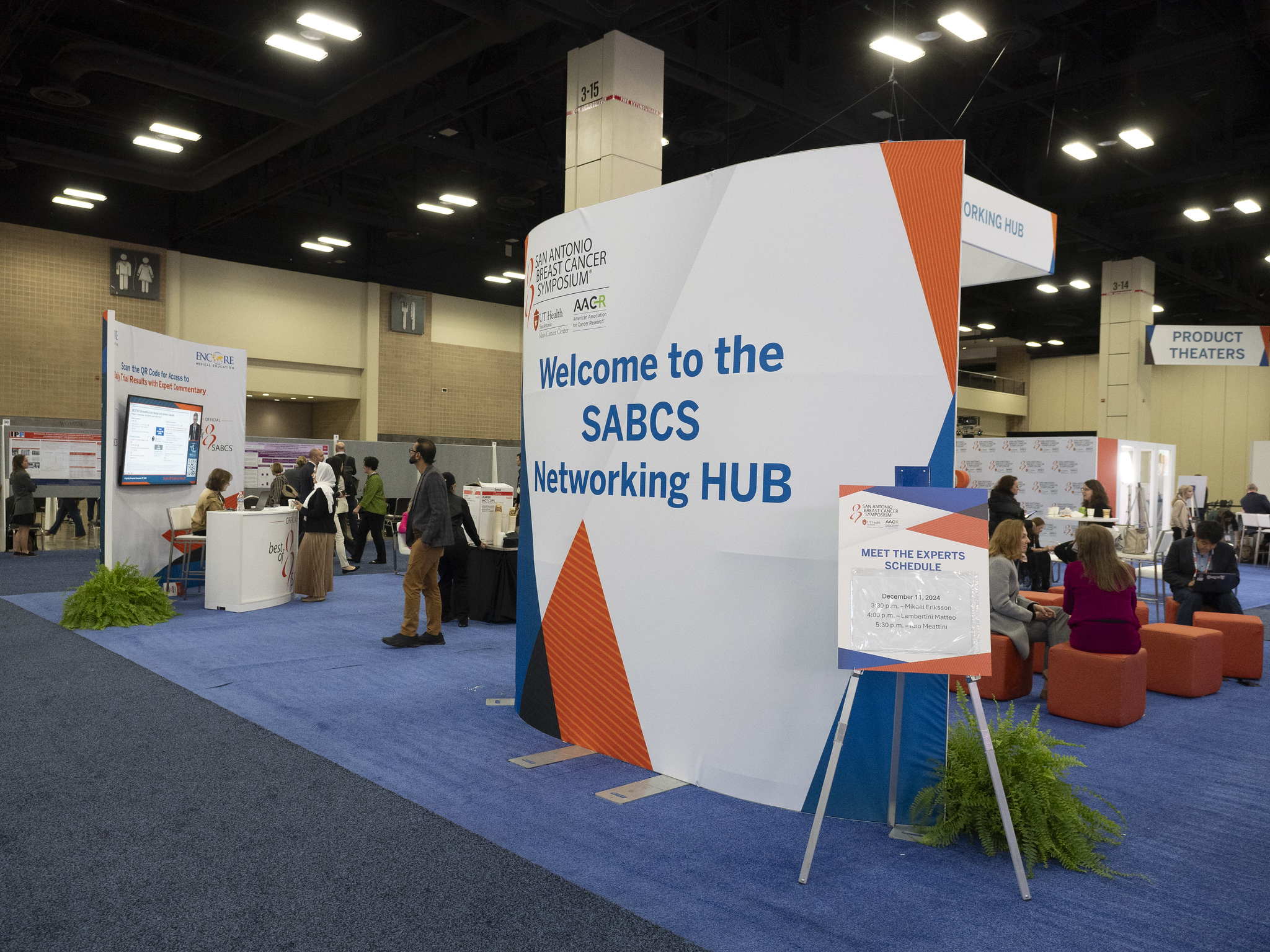 The SABCS booth (Booth 650) is home to the SABCS Networking Hub. It’s a relaxed place with tables and chairs and couches where attendees can relax, enjoy refreshments, and visit with colleagues. At the Hub, attendees can also watch live recordings of SABCS Snippets — the symposium’s podcast, featuring session insights from highlighted speakers — and staff are on hand to answer questions about the international Best of SABCS programs.